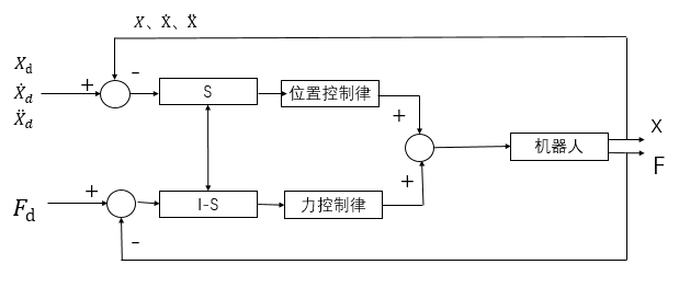 Hogan提出的阻抗控制概念:以“弹簧-质量-阻尼”模型对机器人末端力位控制进行等效处理,建立机器人末端位移和接触力之间的关系,通过一定的控制策略调节系统的惯性、阻尼、刚度等参数实现对力和位置偏差的控制。阻抗控制不是直接控制期望的力,而实通过控制力与位置之间的动态关系实现机器人的柔顺控制。为了提高阻抗控制的效果,Jung.S等人在阻抗控制模型中,将实际力与期望力的偏差作为力控制的反馈信号,对阻抗控制理论进行了较好的补充[8]