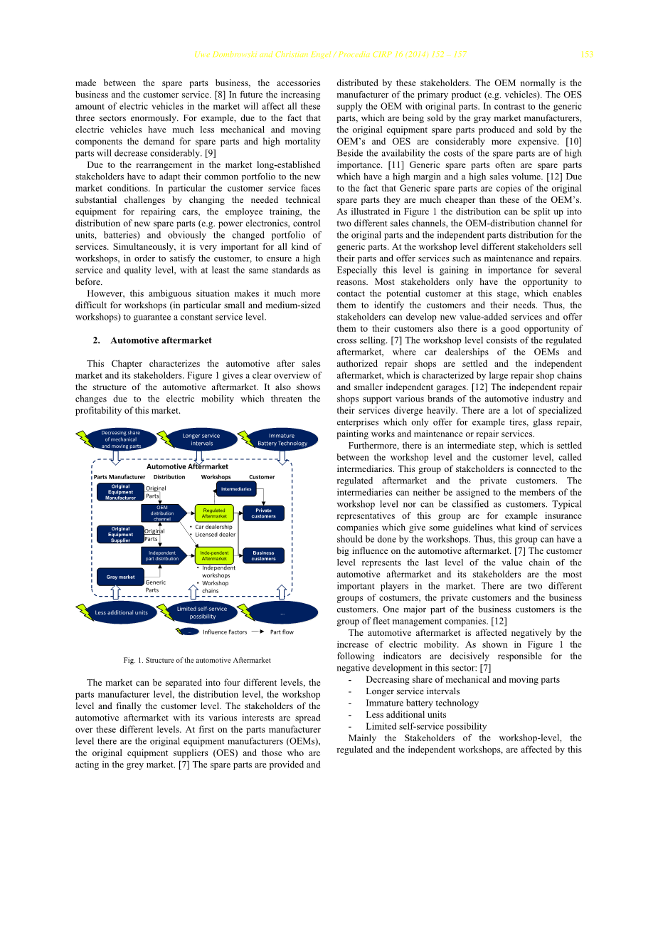 市场可以分为四个不同的层面,零件制造商层、分销商层、维修店层,最后是客户层。有着各种利益的汽车售后市场的利益相关者分布在这些不同层面。首先在零件制造商层面,有原始设备制造商(OEMs),原始设备供应商(OES)和那些在灰色市场中行事的人。备件由这些利益相关者提供和分发。OEM通常是主要产品(例如车辆)的制造商。OES为OEM提供原装零件。与灰色市场制造商销售的通用部件相比,OEM和OES生产和销售的原始设备备件相当昂贵。除了可用性之外,备件的成本非常重要。通用备件通常是具有高利润和高销售量的备件。由于通用备件是原始备件的备用,因此它们比OEM的便宜得多。如图1所示,分销可以分为两个不同的销售渠道,即原始零件的OEM分销渠道和通用零件的独立分销渠道。在维修店层面,不同的利益相关者出售他们的零件并提供保养和维修等服务。特别是由于几个原因,这个层面越来越重要。大多数利益相关者只有在此阶段有机会联系潜在客户,这使他们能够识别出客户及其需求。因此,利益相关者可以开发新的增值服务并将其提供给他们的客户,这是很好的交叉销售机会。维修店层面包括授权的售后维修店(包括OEM和授权维修店的汽车经销商)以及独立的售后维修店(分为大型维修连锁店和较小的独立维修店)。独立维修店支持汽车行业的各种品牌,他们的服务分歧很大。很多专门的维修店只提供轮胎、玻璃修复、涂装工程和保养或维修服务。
