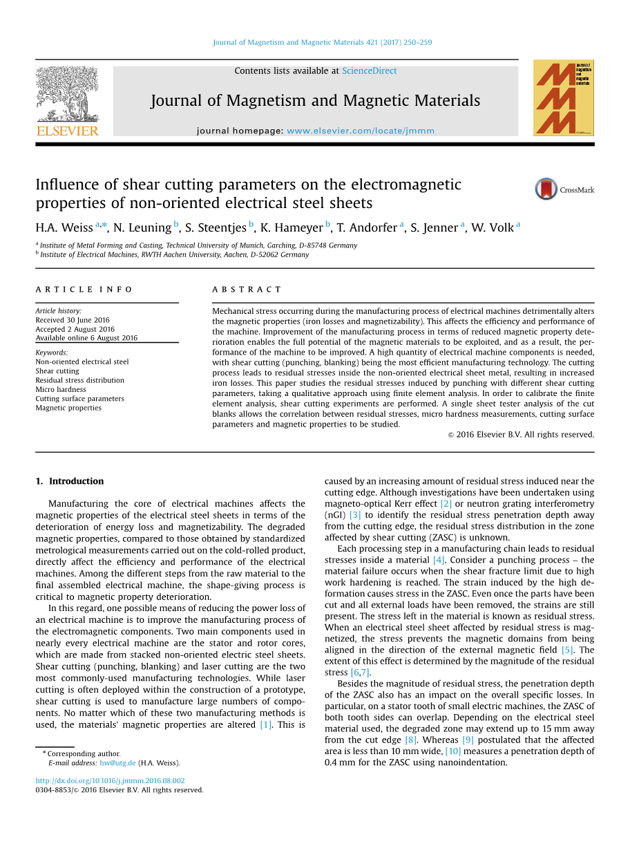 在这方面,改进电磁部件的制造过程可能是一种减少电机功率损耗的方法。定子和转子铁芯几乎是每台电机都要使用的两个主要部件,它们由堆叠的无取向电工钢板制成。剪切(冲孔,冲裁)和激光切割是两种最常用的制造技术。激光切割通常用来制造冲裁模型,剪切切割用于制造大量部件。无论使用这两种制造方法中的哪一种,材料的磁性都会发生变化。这是由于切削刃附近会产生残余应力。尽管目前已经使用磁光克尔效应和中子光栅干涉测量法(nGI)进行了研究,确定了远离切削刃的残余应力穿透深度,但受切割影响区域(ZASC)的残余应力分布未知。