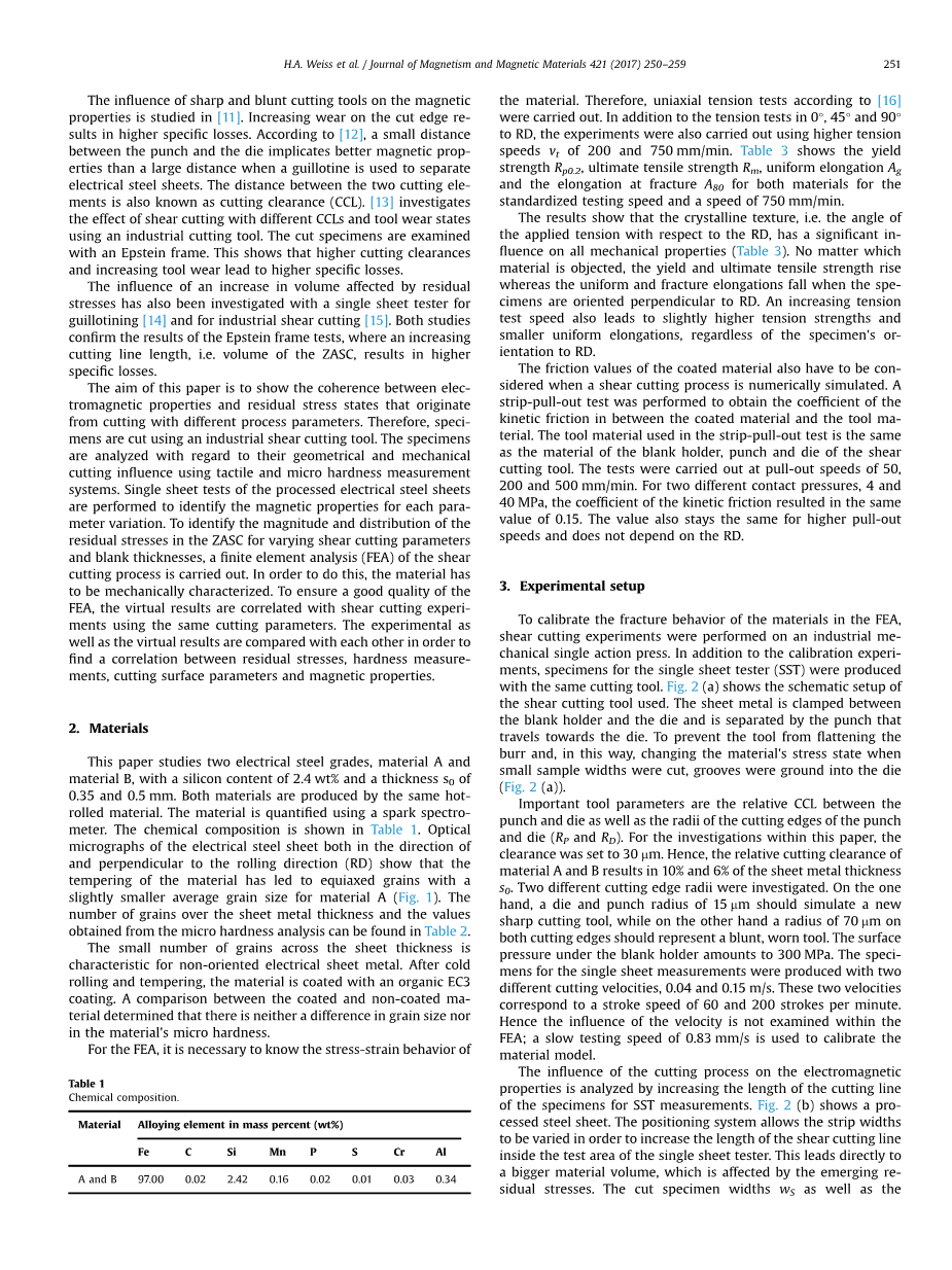 在研究锋利和钝的切削工具对磁性能的影响后,发现切割边缘的磨损加剧时会导致更高的磁性损失。根据相关文献,当使用剪板机切割电工钢板时,冲头和模具之间的距离较小时可以使电工钢板有更好的磁性。两个切削元件之间的距离称为切削间隙(CCL)。使用工业切削工具来研究剪切切削时不同的CCL和刀具磨损状态的影响,用Epstein框架检查切割的样品。结果表明更高的切削间隙和更严重的刀具磨损导致更高的特定损耗。