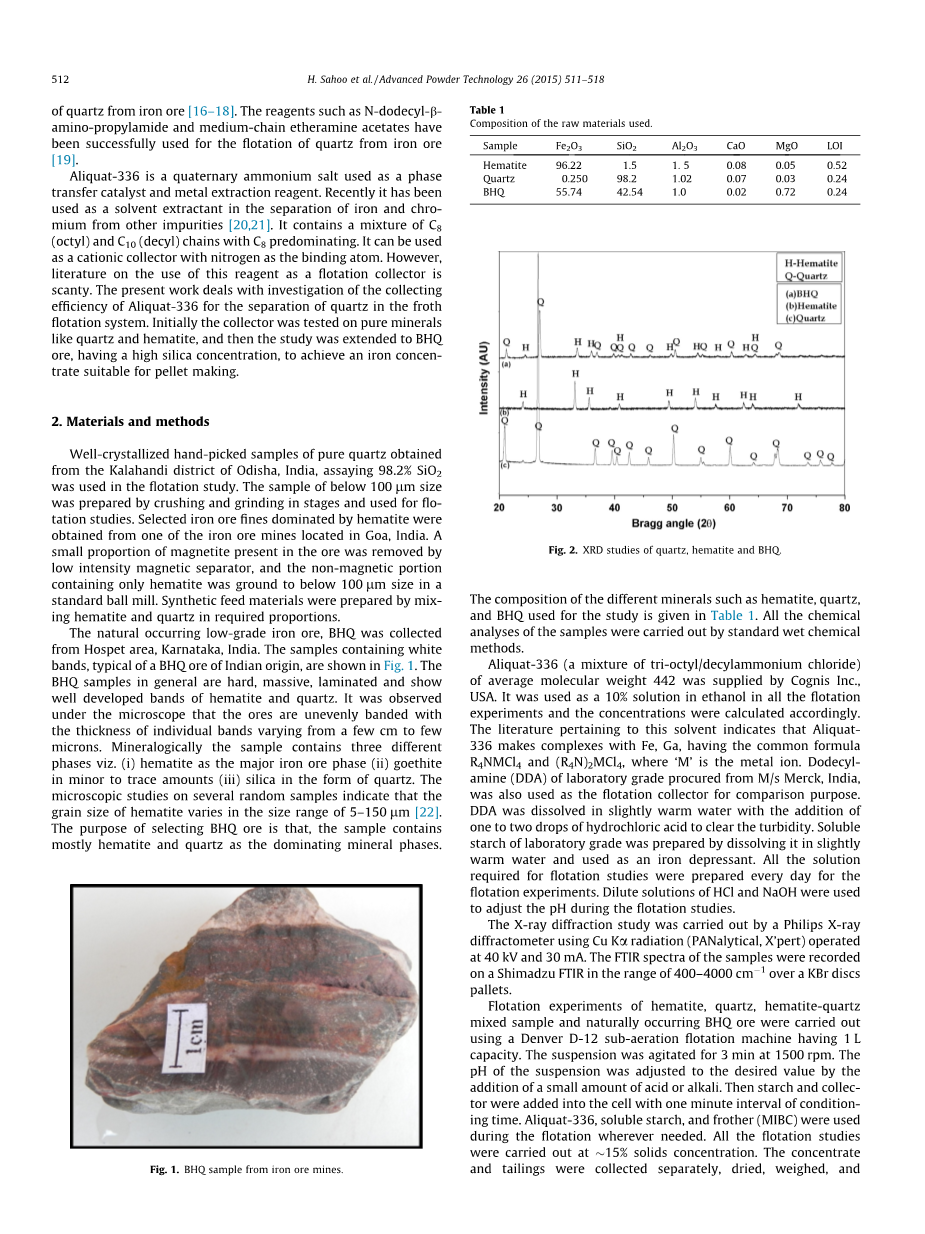 Aliquat-336是一种用作相转移催化剂和金属萃取剂的季铵盐。近年来,它被用作溶剂萃取剂,用于从其他杂质中分离铁和铬[20,21]。它含有以C8为主的C8(辛基)和C10(癸基)链的混合物。它可用作带氮结合的阳离子捕收剂。然而,关于这种试剂作为浮选捕收剂的文献报道甚少。本文研究了在泡沫浮选系统中,用Aliquat-336对石英进行分离的捕收效率。该捕收剂最初是在石英和赤铁矿等纯矿物上进行测试,然后将研究扩展到具有高硅浓度的BHQ矿,以获得适于制球的铁精矿。