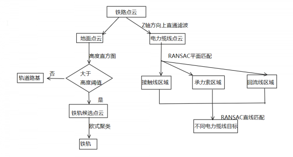 具体到铁路点云分割方面国内对铁路点云分割的研究通常是通过机载雷达获取的数据对铁路上方电力线进行分割。余洁,穆超,冯延明等利用三维霍夫变换分离出电力线点,最后再利用函数拟合得到电力线的方程[[4]]。王平华,习晓环,王成等在对电力线的提取中,利用随机采样一致性的方法对电力线进行提取[[5]]。王凡,许筱通过结合铁路区域的空间分布特征,先提取出最上方的承力索,在利用alpha-shapes算法对轨道点进行检测[[6]]。在国外,2015 年,Arastounia[[7]]针对特定的乡村铁路提出了一种铁路点云分割方法,通过结合铁路的先验知识,先分割出铁路轨枕目标,其次通过设定相应的阈值提取出铁轨,最后根据铁路的拓扑结构分割出电力线目标。2018 年,A. Sánche[[8]]利用隧道先验知识结合区域生长算法将点云分割分成地面分割和非地 目标分割,对隧道中的目标实现了良好的分割效果。陈坤源,程明,王程利用霍夫检测和中心点偏移对承力索的悬挂点进行了提取[[9]]。铁路点云分割中最多研究的是铁轨和电力线目标,铁轨和电力线都是线性目标,是由一些基本的几何基元组成,所以采用基于模型驱动的方法可以较好的分割出目标物体,但由于该算法引入了相应的数学模型,当分割目标比较复杂时,采用模型匹配的方法就较难得到满意的效果。此时就需要采用基于数据驱动的算法,深入研究每个点集邻域的一些属性,结合先验知识设定相应的阈值来得到最终的分割结果。在论文中结合使用了基于模型驱动和数据驱动的方法,以达到鲁棒性更好的分割效果。