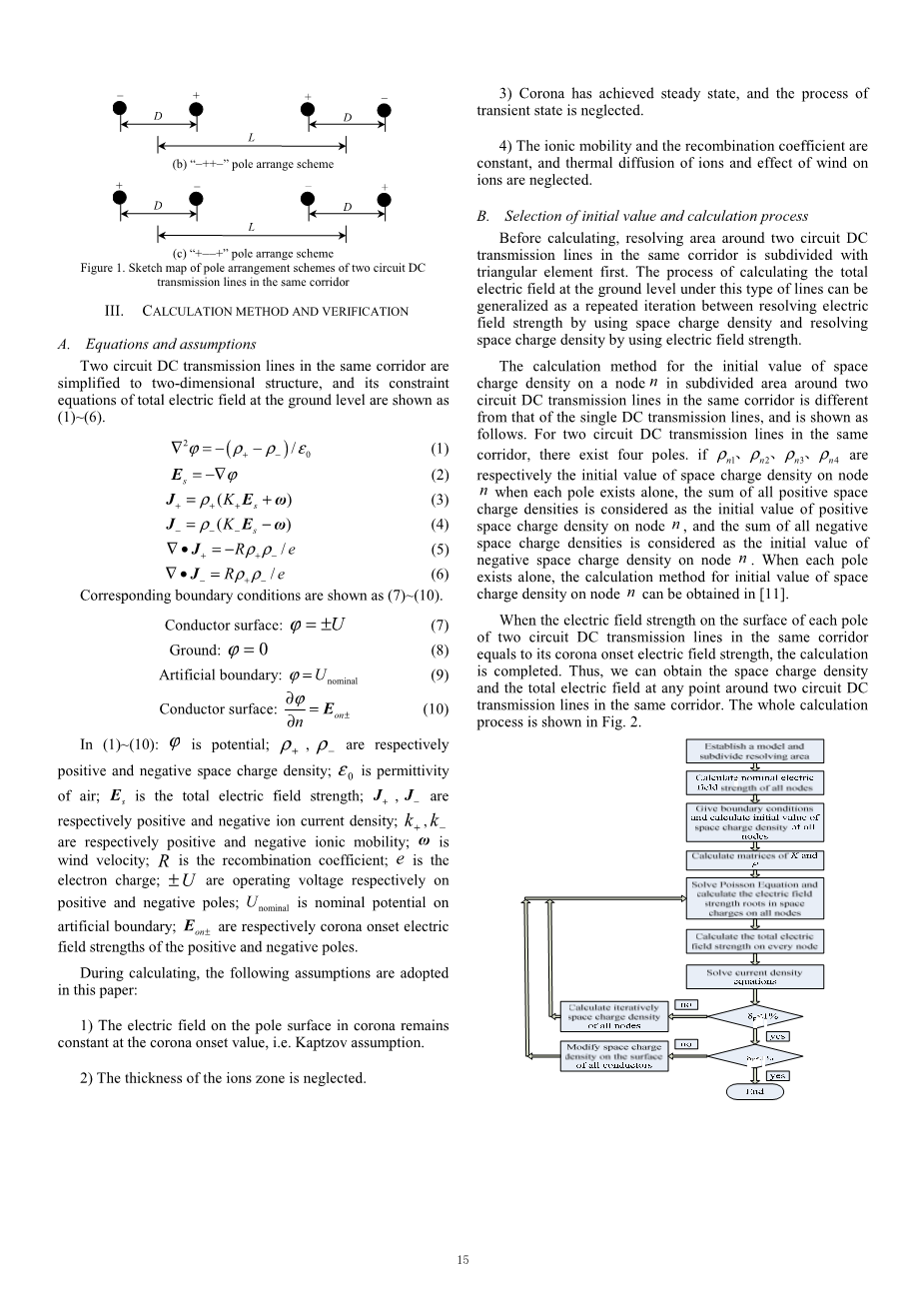 当各极导线表面电场强度大于电晕起始电场强度时会产生电晕放电,并且离子流浓度与合成电场非线性相关。这些上述因素会导致高压直流(HVDC)线的合成电场的边界值是非线性的且无法用线性方法解决。所以,当我们想要推测同走廊两回路直流输电线路的地面合成场强时,必须要考虑到两回路直流输电线路彼此之间的影响。