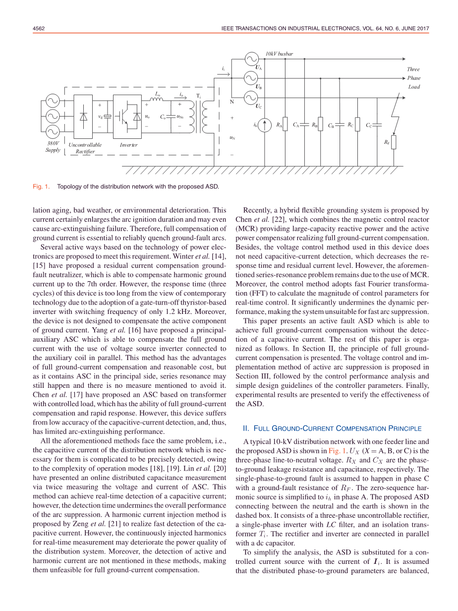 本文提出了一种无需检测电容电流就能实现全接地电流补偿的有源故障ASD。其余部分列举如下:第二节介绍了全接地电流补偿的原理,第三节提出了有源消弧的电压控制和实现方法,并对控制器参数进行了控制性能分析和简单的设计指导。最后,通过实验验证了该方法的有效性。