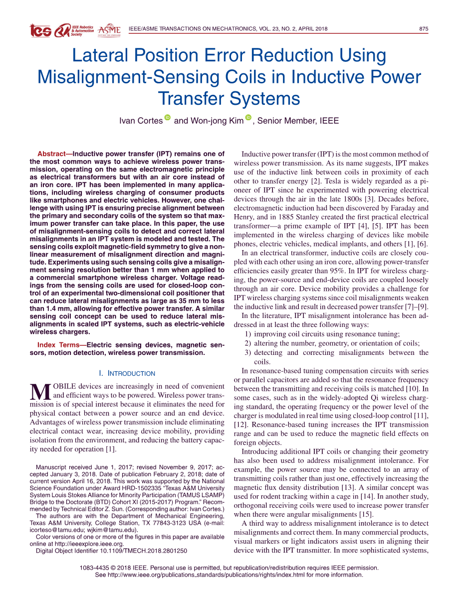 抽象—感应功率传输(ipt)仍然是实现无线电功率传输的最常见方式之一, 其工作原理与电力变压器相同, 但它安装的是空气核心而不是铁芯。如今ipt 已在许多应用中实施,包括智能手机和电动汽车等消费类产品的无线充电。然而,使用ipt仍存在挑战,即确保系统的主线圈和次线圈之间的精确对准,以便实现最大功率传输。本文在ipt 系统中利用错位传感线圈对横向错位进行了检测和校正。传感线圈利用磁场对称法进行误差方向和大小的非线性测量。使用这种传感线圈的实验在应用于商用智能手机无线充电器时, 具有超过1mm的错位传感分辨率。当传感线圈的电压读数用于实验二维线圈定位器的闭环控制,可将高达35毫米的横向错位减少到1.4毫米以下,从而实现有效的功率传输。类似的传感线圈概念可用于减少横向错位的规模 ipt 系统, 如电动汽车无线充电器。