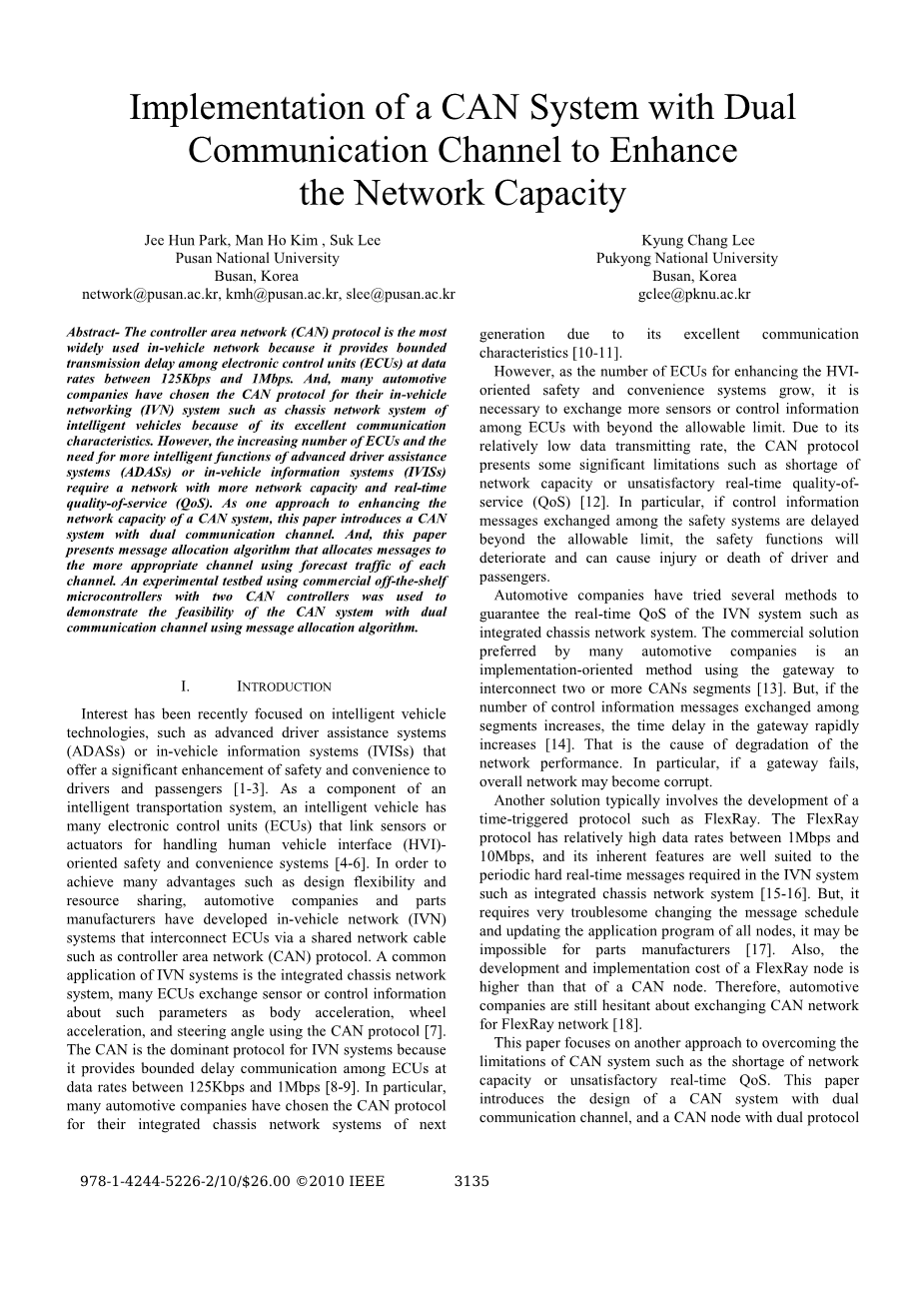 本文主要讲述另一种克服包括网络容量短缺和实时服务质量不足等CAN系统限制问题的方法,本文介绍双通道CAN系统设计和带有双协议控制器和收发器的CAN节点。由于最近的微控制器科技的创新,几个带有2个或更多的CAN控制器的商业化的现成的微控制器现在是可获得的。如果2个或更多的通讯通道被用于在电子控制单元内交换信息,那么网络容量将会增大,并且在CAN数据库没有任何更改的情况下网络的性能将会加强。但是,CAN系统的有效开发和操作需要在CAN节点的两个通道进行精确地流量分配,本文展示了一个通信预测思路,即分配流量去更精确的通道去优化网络性能的每个通道的通信和流量分配算法,这样一个CAN系统。实验证明:使用商业化的现有的带两个CAN控制器的微处理器用于论证带双通道的CAN系统是可行的。