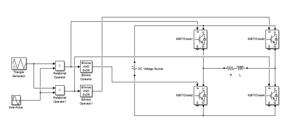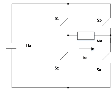 图中所示的-是桥式电路的4个桥臂,是由电力电子器件以及辅助电路组成。当开关,闭合,,断开时,负载电压为正;当开关,闭合,,断开时,负载电压为负,这样,输出电压的方向发生改变,直流电就变为了交流电,只需要使两对开关的切换频率发生变化,就可以改变输出的交流电的频率[8]。