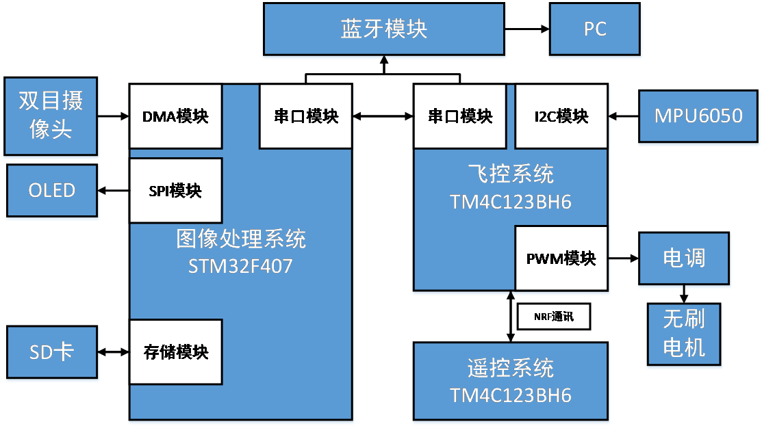 其次,本文建立了一套基于无人机的电力线路巡检系统硬件结构。其硬件结构采用模块化设计,主要由图像处理系统和飞控系统构成。图像处理系统包括DMA模块、串口模块、SPI模块、存储模块,飞控系统包括串口模块、模块和PWM模块,并对两个系统协同作用的方法和电路结构进行了分析和说明。