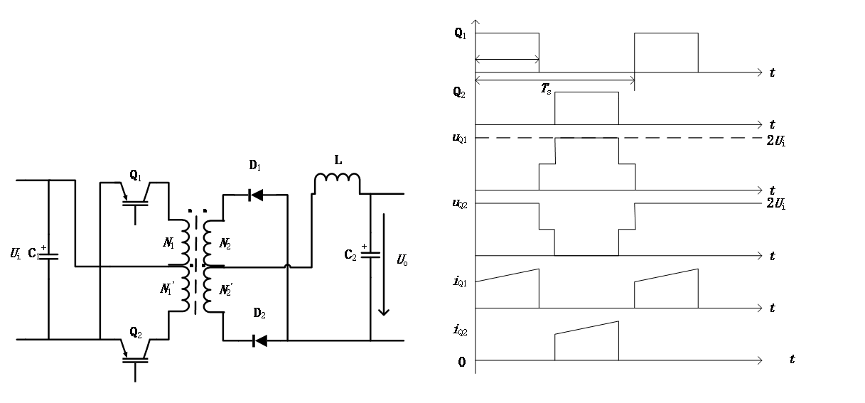 PWM型DC-DC变换器的作用,是利用PWM技术将一给定的直流电转变成另一要求输出的直流电。通常情况下,我们可以根据DC-DC变换器是否在输入端与输出端之间运用高频变压器实现电气隔离,将电路分为两种,它们分别是:非隔离型DC-DC 变换器和隔离型DC-DC变换器。非隔离型DC-DC变换器中只存在直流电,不存在交流电,变换器通过开关管的关断对输入直流电进行斩波处理,因此也被称为斩波电路。斩波电路主要包括降压斩波电路、升压斩波电路、Cuk斩波电路等等;隔离型DC-DC变换器由于高频变压器的存在,一般先逆变后整流,可靠性较高。变换器中既存在直流电,也存在交流电,主要包括正激电路、反激电路、半桥电路、全桥电路、推挽电路五种。此外,为了减少损耗和改善电力电子器件的工作环境,隔离型DC-DC变换器中的高频变压器各绕组应紧密耦合,尽量减小漏感。