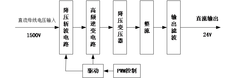 Through simulation, we need to realize: output voltage 24V, power 5kW, output voltage fluctuation 5%, output current fluctuation 10%.Simulation results show that the design can effectively reduce the input dc bus voltage, and the output dc meets the requirements, stable output.
