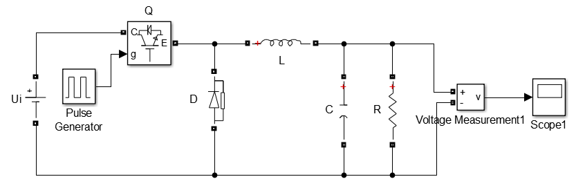 Buck DC-DC变换器的主电路,元器件从左至右依次为功率全控开关器件Q(图中为IGBT)、二极管D、输出滤波电感L和输出滤波电容C。全控开关器件Q与负载R侧电路串联。