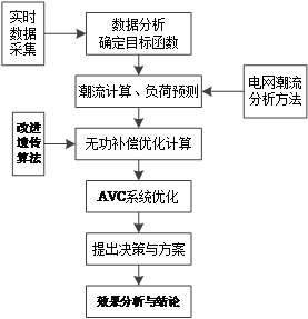 本文需要完成的主要工作任务就是结合某个地级市电网的实际情况,分析和研究该地区电力网络中各主要变电站的电压无功优化的相关问题,并合理的建模、仿真及计算。在此基础上,对变电站内无功补偿设备的配置和AVC系统控制策略等方面提出适合该地区电网的无功优化相关改进与设计的方案。流程图如图1-1所示。根据流程图,本文主要解决的技术问题分为四个方面,分别是控制目标和模型的建立,求最优解的方法实现,无功补偿的优化设计以及适合该地区的一个改进方案。