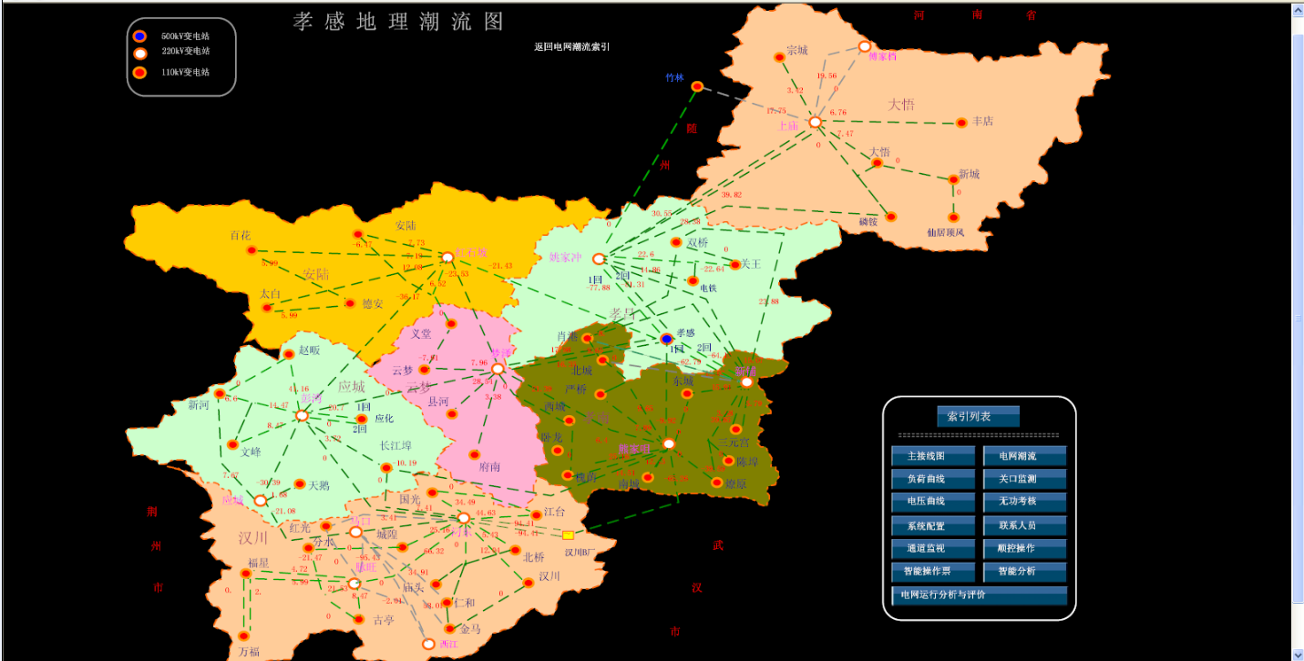 湖北省孝感市是湖北省内的电力重镇之一。其采用的是220KV主环网运行、110KV分布扩散的运行方式。根据最近的数据统计,该地在全网共同建设并投运11座220KV变电站,48座110KV变电站。主变容量之和共计5750MVA。全区的电源种类较多,且非常分散,约有250万千瓦的总装机容量接入该地区。该地区的历史最高负荷是176.5万千瓦,于2014年11月5日出现。