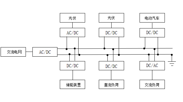 传统课本教材告诉我们,通常电网主要有发电、输电、配电三个环节,按照发输配电要求将电能从发电厂配送至用户端。新时代电网为了提高效率、减少损耗,提出将新能源发电方式与传统发电方式并网运行。经查阅可知,由于传统发电方式与新能源发电方式存在着较大的电压等级差异及电网容量差异,所以一般将并网点安排至配电区。要想改变这一差异,顺应时代潮流,则需改变配电网的运行方式,将电源嵌入到配电网中。新时代电网全方位覆盖发展,为解决分布式电源复杂多样的并网问题、实现其高效灵活运用,特此引入微电网的概念,充分提高分布式光伏发电的效率及价值,也使传统电网逐渐向智能电网过渡。[4]含分布式光伏与电动汽车负载的结构示意简图如图2-1所示: