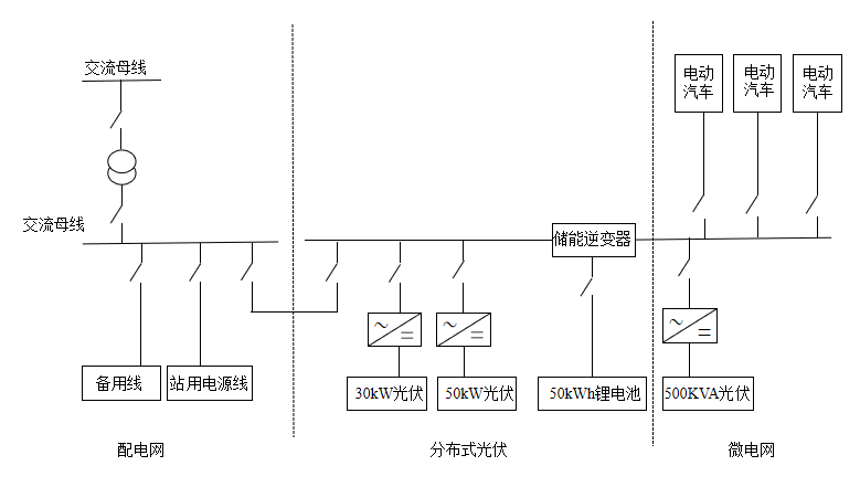 根据本地区电动汽车用户的用电特性,结合可再生能源光伏的分布情况,构建含分布式光伏发电系统及储能微电网,考虑分布式光伏电源/微电网并网运行控制技术研究的需求,从配电网、分布式光伏和微电网三个部分构建设计电气网络拓扑结构[5],具体配置如下图2-2所示: