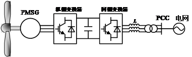 直驱式风力发电系统如图1.4所示,通常采用永磁同步发电机,通过一组背靠背变流器将风机与电网隔离,实现在不同风速下风机对电网的恒频输电。这种结构的优点是可以省略掉齿轮箱,减少了传动损耗,同时由于精简了机械结构,提高了系统的可靠性。 但是其传输功率需全部经过变换器馈入电网,所以需要大容量的变换器,增加了设备成本与损耗。