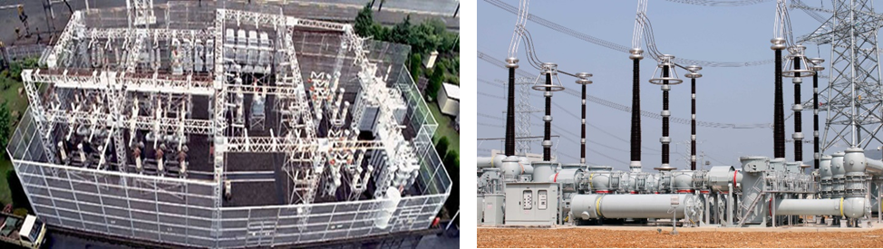气体绝缘变电站(Gas Insulated Substation,简称GIS)将母线、断路器、隔离开关、互感器等元件组合封闭在气室中,采用绝缘性能良好的SF6气体充当绝缘介质。与敞开式的空气绝缘变电站相比,GIS运行可靠性高、结构紧凑、便于安装、维护周期长,如图1.1所示。近年来GIS广泛应用于高压和特高压领域,国家电网公司的统计结果表明,截至2015年底,63-1000kV 气体绝缘组合电器在运量已经超过60000间隔,年平均增长率大于13%[1]。