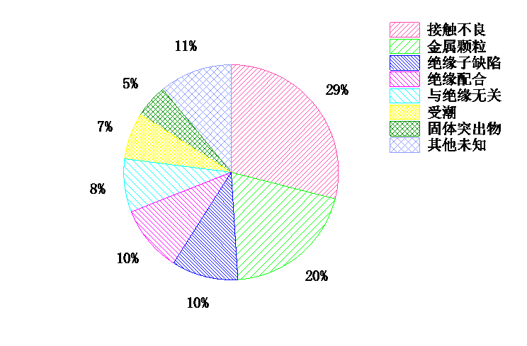 虽然GIS设备的可靠性非常高,具备少维护甚至免维护的优点,但GIS内部仍然存在一些潜伏性绝缘缺陷,这些绝缘缺陷在初始阶段可能是无害的,对绝缘状态没有太大影响,在常规的出厂试验或交接试验中也不容易被发现,然而随着运行时间的增长,会逐渐降低设备的绝缘性能,进而诱发绝缘故障,故障严重时可能会出现电网大范围停电。近年来GIS故障在各类设备故障中所占比例不断增加,已经成为影响电力系统安全稳定运行的重要因素。国际大电网委员会(CIGRE)的统计结果表明,绝缘故障在GIS故障中所占比例过半,且大部分的绝缘故障都发生在电压等级较高的GIS设备中[2],以252kV和126kV电压等级的GIS设备最为普遍[3]。GIS设备中常见缺陷类型统计如图1.2所示[4]。