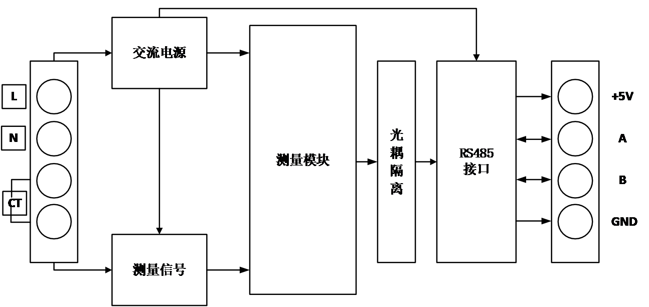 居民用电行为采集终端作为数据监测和采集的基础,需要保证它运行的稳定性以及测量的准确性和可靠性。本部分主要是设计出对各电器设备用电信息采集系统的构建,分为五个部分:测量信号、交流电源、测量模块、光耦隔离以及RS485接口(使用485转USB来实现与PC机的连接)。