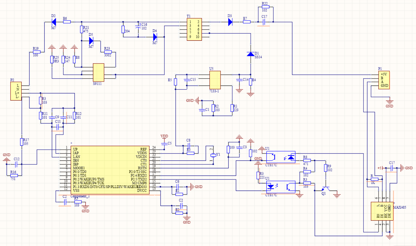 本次电路采用的是电能计量V9881D芯片,V98XX系列是一类性能高、功耗低的单相电能计量的SoC芯片,它集成了模拟前端、增强型8052内核、电能计量模块、WDT、RTC 、SRAM、 Flash和LCD驱动等功能模块,提供了一种单芯片实现多功能电表的思路。
