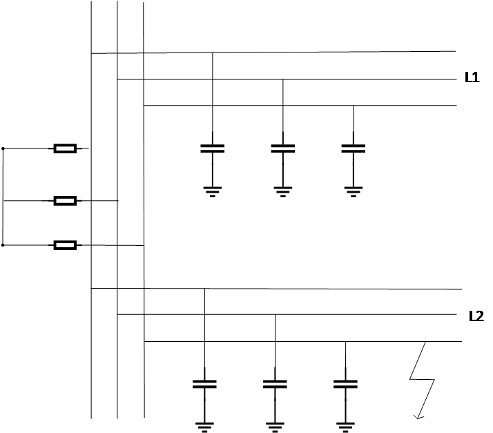 在我国大部分中低压配电网中,中性点不接地的运行方式广为投入使用。其优点鲜明:当系统发生单相接地时,三相系统依旧保持平衡,因此,在一定时间内可以继续带故障运行。中性点不接地方式的原理图如图2-1所示,其中L1、L2代表电力系统的两条线路,其中L2的C相发生单相接地故障,各线路的对地电容产生电容电流流过接地点。