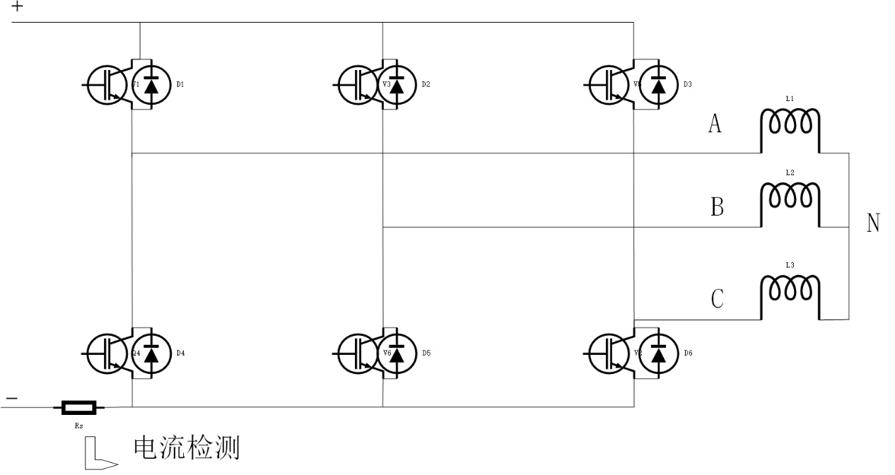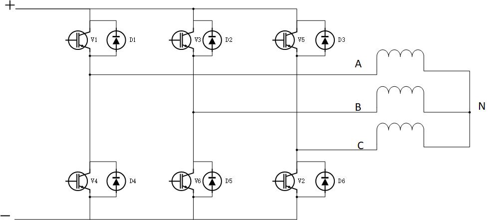 3)驱动电路的成本高低:相位数越多,驱动电路所需的开关晶体管就越多于全桥驱动器,全桥驱动电路开关数量是半桥驱动电路中使用的开关的两倍,在其他部件数量都相同的情况下,开关数量越多的话相应的电路成本也就会越高。而且电动机相的数量越多,那么相应的电动机体的结构也就会越复杂,成本随之越高。综合考虑以上这些因素,三相全桥星形连接驱动模式是使用范围最广泛的。其结构图如图2-2所示。