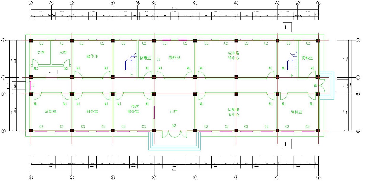 该建筑位于上海市杨浦区,根据《建筑抗震设计规范》GB50011-2010,上海市抗震设防烈度为7度,设计基本地震加速度值为0.10g。为某高校办公楼,结构型式为钢筋混凝土框架结构,结构平面图如图2.1所示。