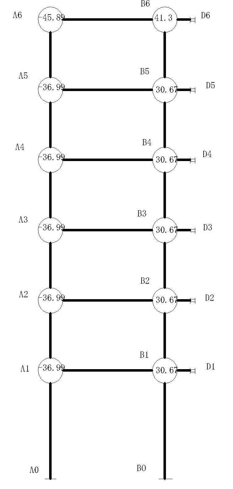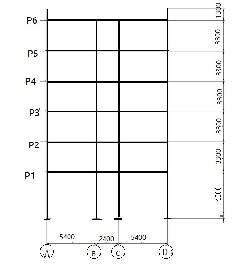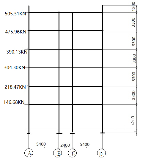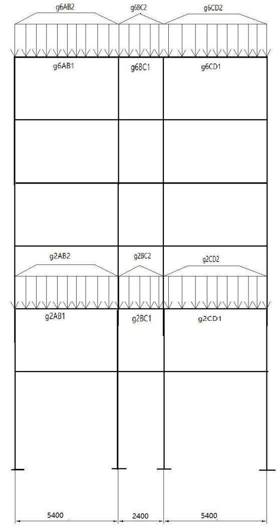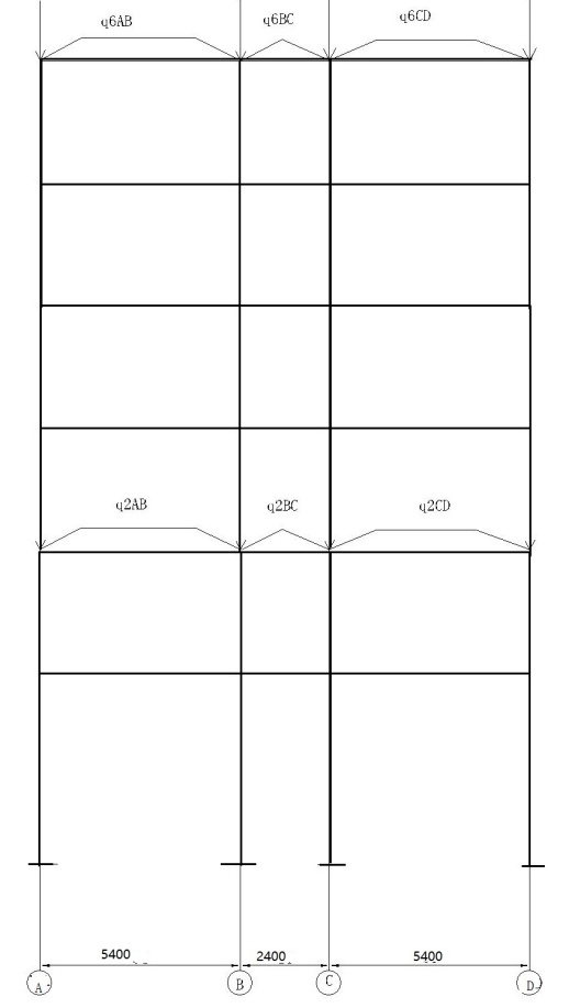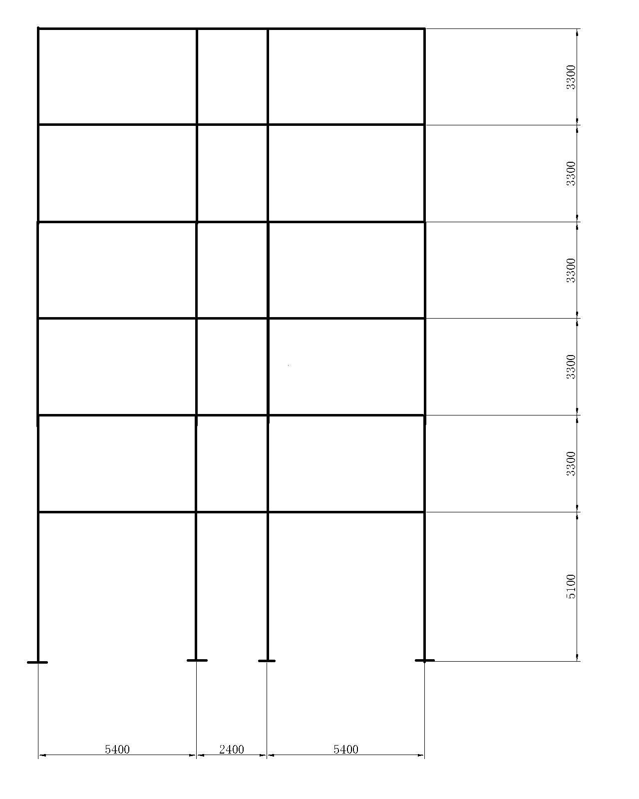 按工程地质资料提供的数据,该场地为Ⅱ类建筑场地,地质条件较好,初步确定采用柱下独立基础,本建筑抗震设防烈度为7度,乙类设防建筑,查《建筑抗震设计规范GB50011-2010》,抗震等级为三级。根据工程概况,挖去所有杂填土,基础置于第二层砂质黏土上,基底标高为设计相对标高-2.0m,柱子底层高度为:h1=3.6m 2.0m-0.5m=5.1m(初步假设基础高度为(0.5m),二至六层柱高为h2~h6=3.3m。柱节点刚接,三跨的计算跨度分别为;5400mm、2400mm、5400mm。本工程选取2轴进行结构设计,其横向框架计算单元如图所示。