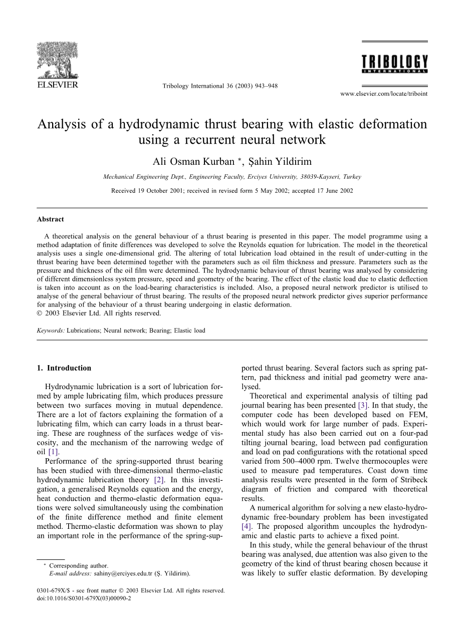 [3] Reddy DSK, Swarnamani S, Prabhu BS. Thermo elastohydro dynamic analysis of tilting pad journal bearing—Theory and experiments. ASME Tribology Transactions 2000;43(1):82–90.