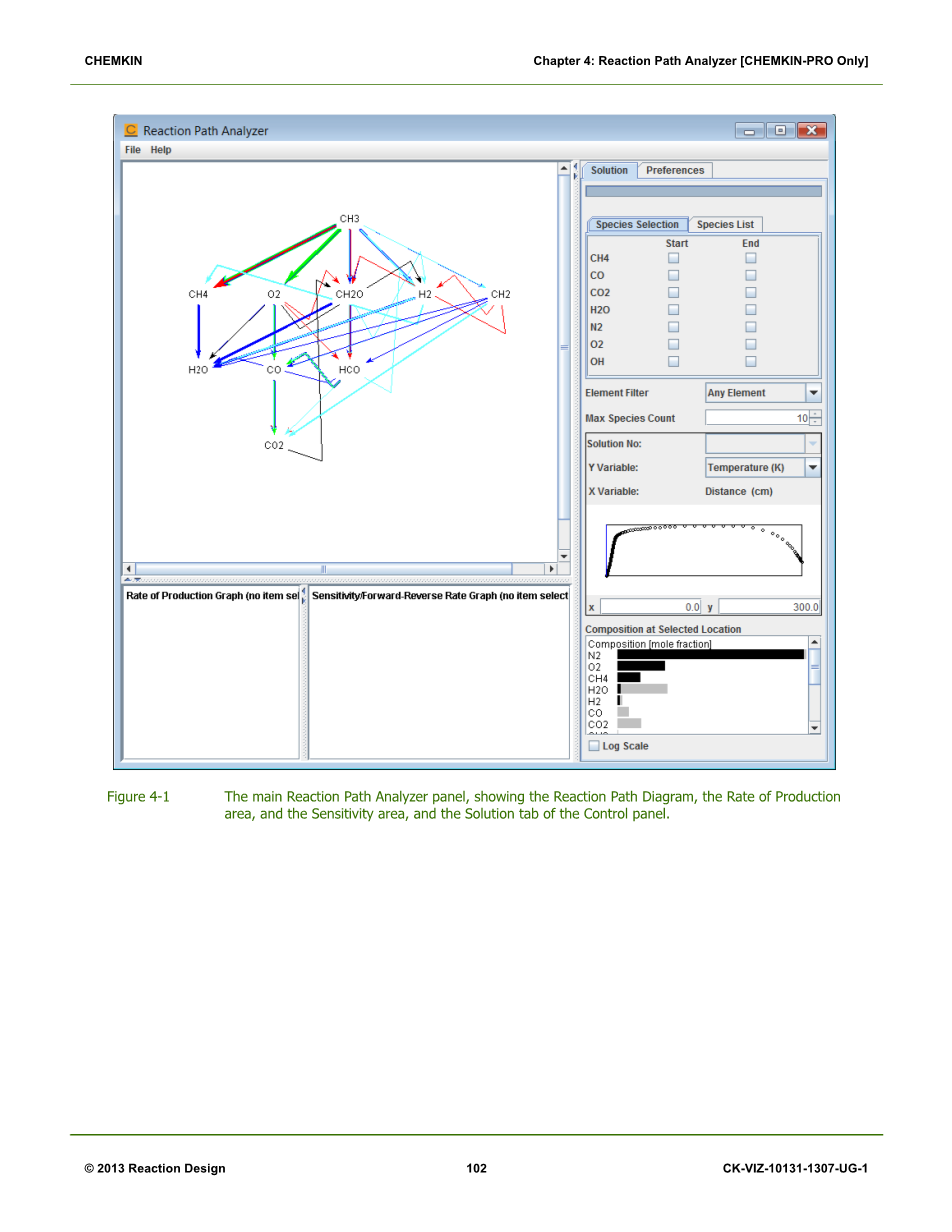 在反应路径图上选定一种物质或一条在物质之间相连的反应路径可激活左下侧的面板,显示出保留的物质生成速率。选定一种物质将会显示这种物质的所有生成速率,不论这种物质在化学反应中是产物或是反应物。选择一条连接两种物质的路径,用对所有路径起作用的生成速率填充图的内容。所有生成速率的数据被显示在图4.1的左下角的条形图中,展示每个反应在线性尺度上的相对贡献。