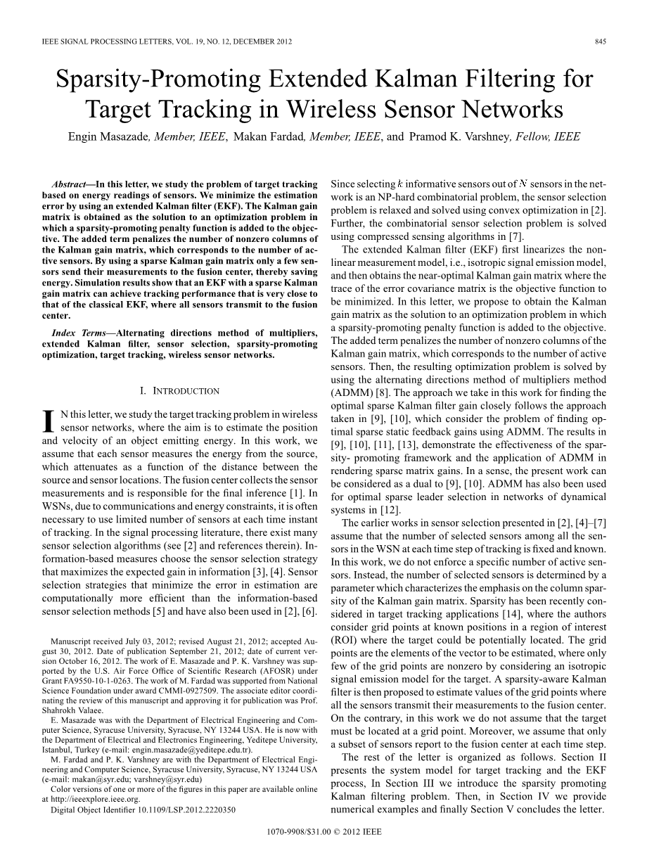 索引术语: 乘法器的交替方向方法;扩展卡尔曼滤波器;传感器选;,稀疏性提升优化;目标跟踪;无线传感器网络;