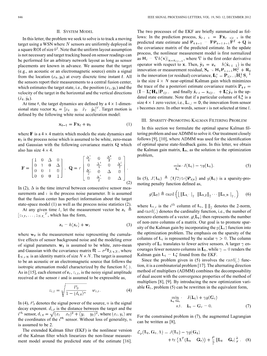 扩展卡尔曼滤波器(EKF)首先线性化非线性测量模型,即各向同性信号发射模型,然后获得近似最优卡尔曼增益矩阵,其中误差协方差矩阵的迹是要最小化的目标函数。在本篇文章中,我们希望获得卡尔曼增益矩阵作为优化问题的解决方案,其中将稀疏性惩罚函数添加到目标中。添加的项惩罚卡尔曼增益矩阵的非零列的数量,其对应于有效传感器的数量。然后,通过使用交替方向乘子法(ADMM)[8]解决了所得数据的优化问题。我们在这项工作中用于寻找最优稀疏卡尔曼滤波器增益的方法与文献[9],[10]中采用的方法非常相似,考虑使用交替方向乘子法找到最佳稀疏静态反馈增益的问题。文献[9],[10],[11],[13]中的结果证明了稀疏性促进框架的有效性以及ADMM在渲染稀疏矩阵增益中的应用。从某种意义上说,目前的工作可以被认为是对[9],[10]的一种复制。在[12]中,ADMM还被用于引导动态系统网络中的最优稀疏选择。