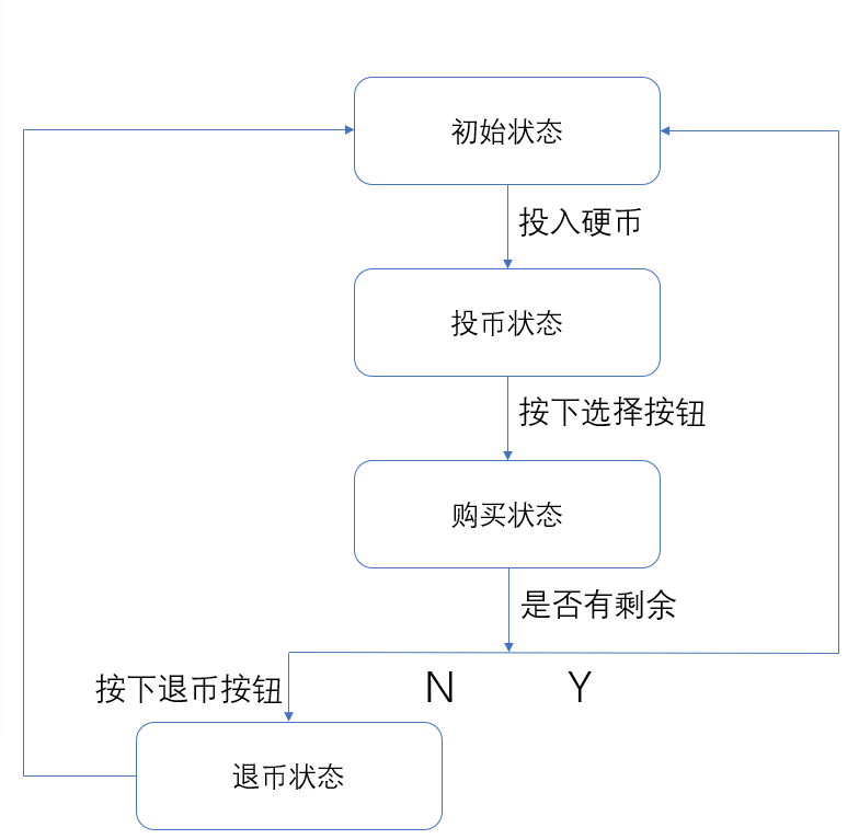 实际生活中,自动售货机流程都如图2.1所示,由初始状态投入金钱,到投币状态,此时自动售货机会内部统计投入金钱数额并显示投入金额,并在能购买的商品显示处亮灯,表示可以购买。当顾客选择购买商品并按下按钮,会到达购买状态,此时机器打开相应商品通道,同时扣除相应金额显示余额。如有适当金额剩余则循环进入初始状态进行下一次购买。如若顾客按下退币按钮,则自动售货机退出余额数目的金钱并返回初始状态。