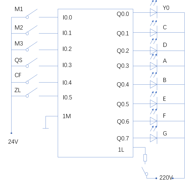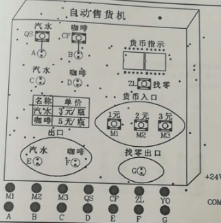 自动售货机的工作面板如图2.2所示,自动售货机中有汽水(3元/瓶)和咖啡(5元/瓶)两种饮料,M1、M2、M3 三个复位按钮表示投入自动售货机的人名币面值(分别是1元、2元、3元)。当余额显示窗口Y0所显示的值大于或等于这两种饮料的价格时,发光二极管C或D会点亮,表明可以购买饮料。按下汽水或咖啡按钮表示购买饮料,此时A或B发光二极管会点亮。同时E或F发光二极管会点亮,表明饮料已从售货机取出;按下ZL按钮表示找零,此时Y0清零,延时0.6s找零出口G发光二极管点亮,表示已经退币。
