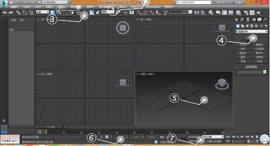 ①标题栏;②菜单栏;③工具栏;④命令面板;⑤工作区;⑥状态栏;⑦动画控制栏;