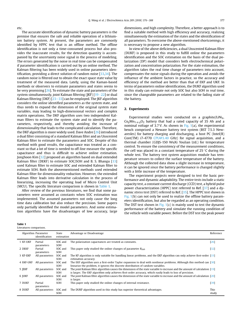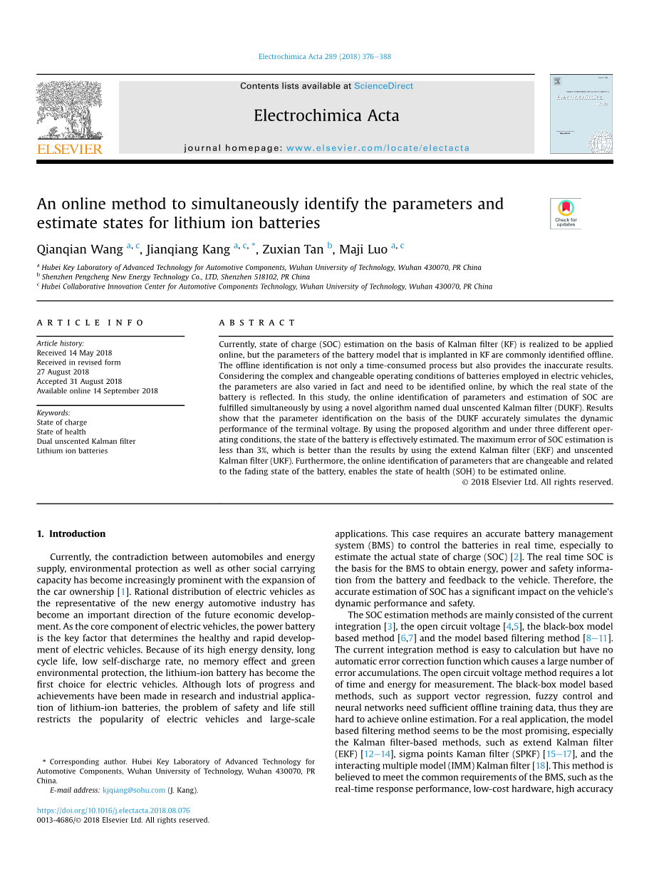 一种用于同时识别锂离子电池的参数和估计电池状态的在线方式外文翻译资料