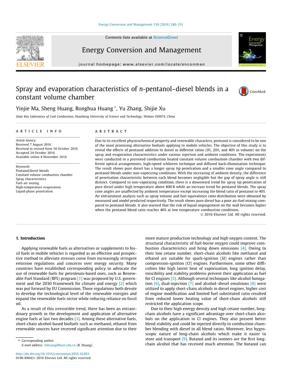 基于定容燃烧弹的正戊醇-柴油混合物的喷雾和蒸发特性外文翻译资料