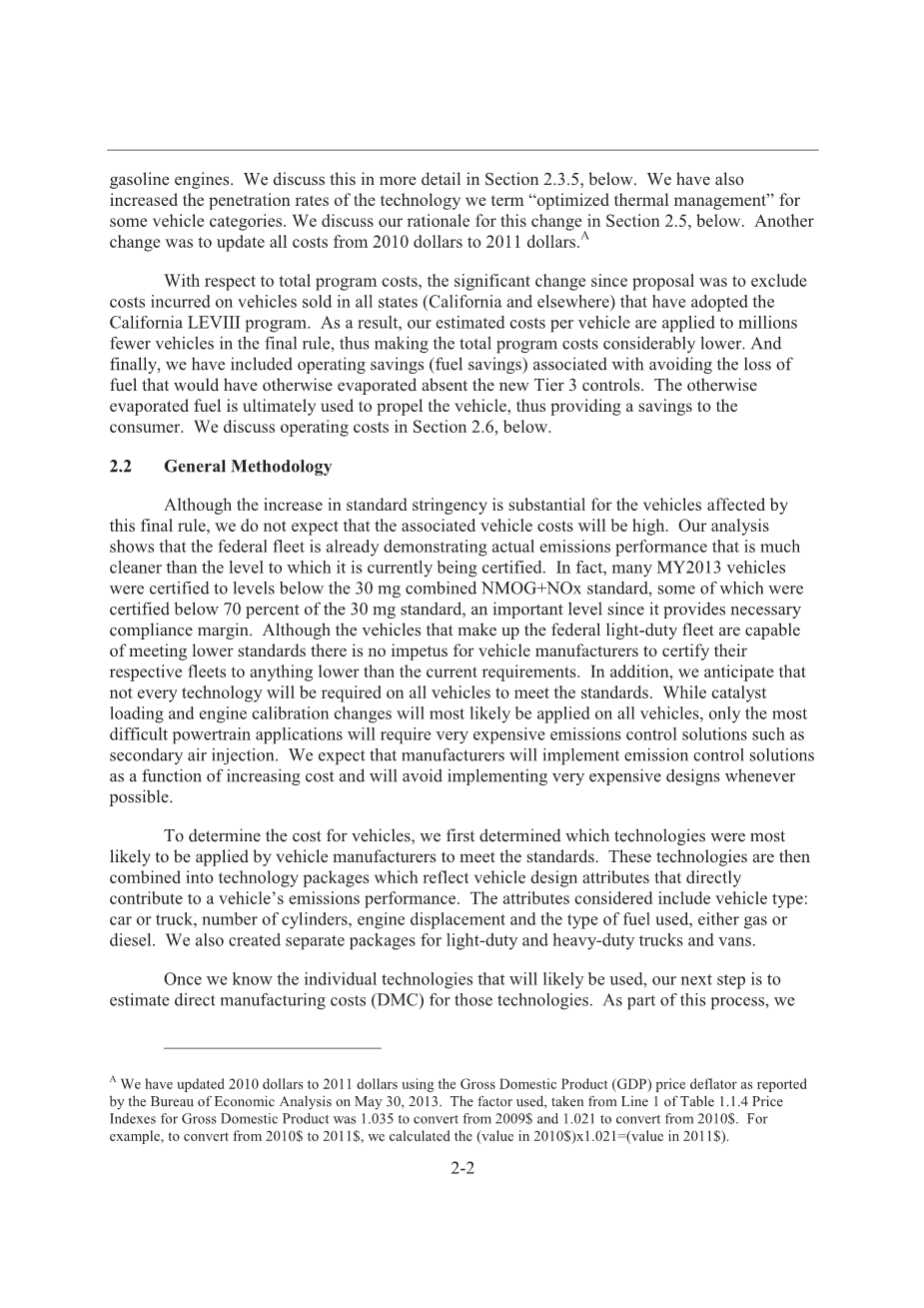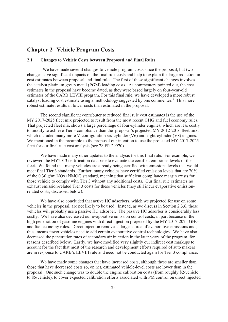 我们做了某些增加成本的更改,尽管这些更改少于那些成本下降的更改,因此估计机动车净成本水平要低于拟定方案的净成本水平,其中一项更改是将发动机标定成本加倍(从大约2美元/机动车增大到5美元/机动车),以涵盖与直接喷射汽油发动机PM控制相关的预期标定工作。我们将在下面第2.3.5节中更详细地讨论这个问题。我们还增大了我们定义为某些车辆种类优化热管理技术的渗透率,我们在下面第2.5节讨论我们更改的理由。另一项更改是所有成本从2010年美元计价更新为 2011年美元计价[1]。