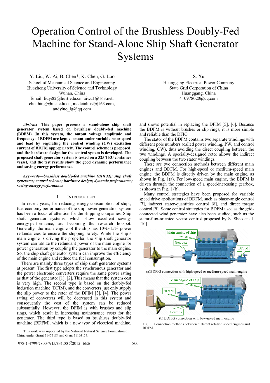 在这篇文章中介绍了基于BDFM的独立船舶轴带电系统及其控制方案。这个独立发电系统的控制目标是:当发电机的转子转速和负载发生变化时,输出电压的幅值和频率保持不变。该发电系统已经在325 TEU集装箱船上进行了测试,试验结果表现出了良好的动态性能和节能性能。由于轴带发电系统的独立运行使船内柴油发电机的运行时间减少。因此,可以显著降低船舶电站的维护成本。目前的研究表明BDFM船舶轴带发电系统显示出巨
