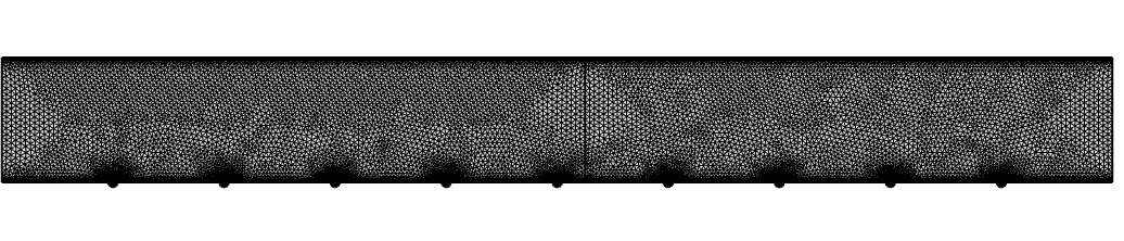 如图2.2的二维模型是先画出一个长方形,然后在下表面画出一个圆并且在x方向阵列这个圆,之后经过布尔运算取交集得到如图2.2所示的二维模型。上面一条线代表光滑壁面,下面的直线与圆弧组成的线代表着凹坑表面,左边为层流区,右边为湍流充分发展区。通过软件设置进出口变量对流体介质从左进口到右出口进行模拟仿真计算。