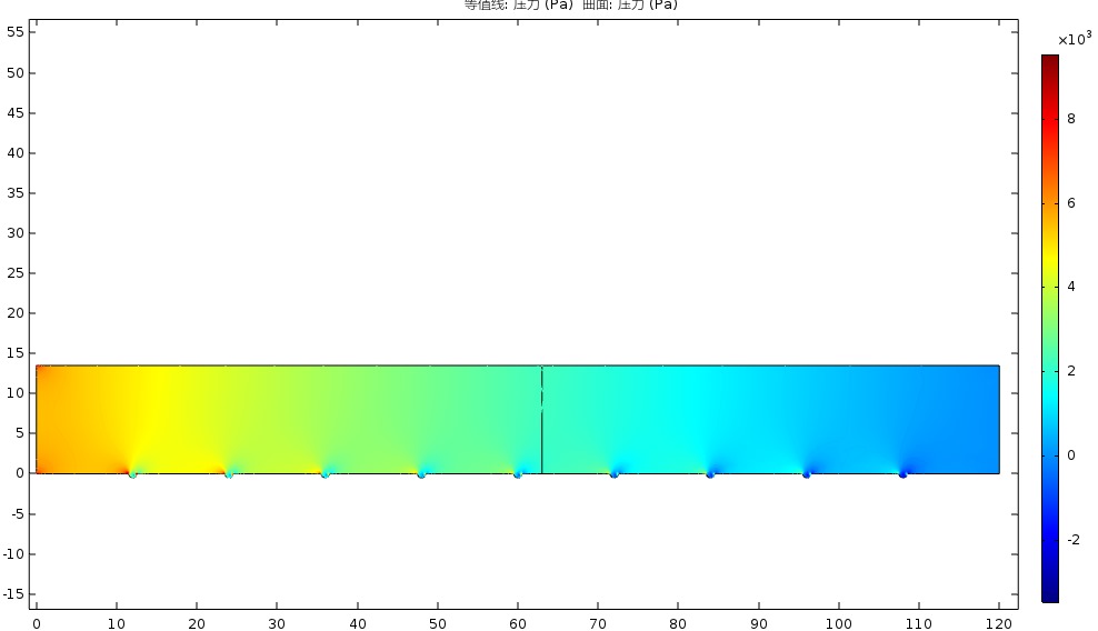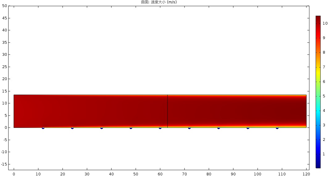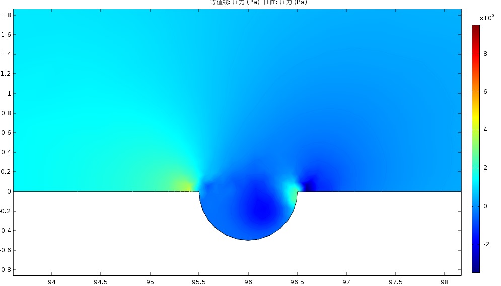 然而实际上,在用comsol multiphysics计算三维模型的时侯,由于受到计算机硬件条件以及仿真时画网格和计算时间的限制,做了如图2.2的二维模型来代替图2.1的三维模型来进行模拟仿真计算,但事实上二维的这种模型在大大的减少了网格划分的时间和计算的时间的同时,二维模型也是能够说明流体介质在流过凹坑表面时的减阻效果,最后通过对二维模型分别算出光滑表面和凹坑表面的摩擦阻力,分析得到的数据也是能够说明凹坑模型的减阻效果。