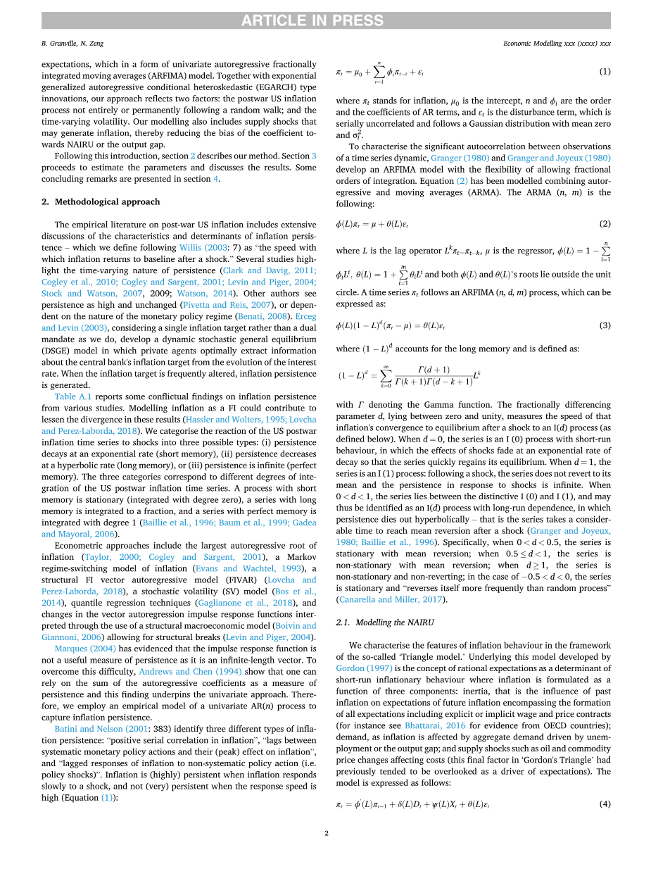 根据Mavroeidis等人的建议,充分利用Phillips曲线的权衡。(2014年),我们的方法是基于过去的冲击推动通货膨胀动态,而不是像新凯恩斯菲利普斯曲线(NKPC)模型那样的前瞻性预期。我们利用通货膨胀滞后来检验1957年至2015年的月度通胀数据,以克服不完全理性预期的问题(Gali和Gertler,1999)。与传统的菲利普斯曲线模型不同,后者将滞后通货膨胀率系数的总和限制为统一(Williams,2006),我们利用滞后通货膨胀作为期望的代表来捕捉通货膨胀持续性的程度。单变量自回归分数积分移动平均(ARFIMA)模型的形式。与指数广义自回归条件异方差(EGARCH)类型的创新一起,我们的方法反映了两个因素:战后美国的通货膨胀过程并非完全或永久性地随机行走和时变波动。我们的建模还包括可能产生通货膨胀的供应冲击,从而减少系数对NAIRU或产出缺口的偏差。