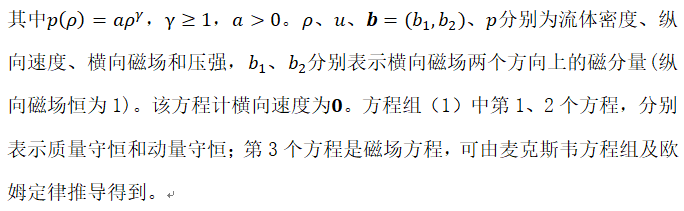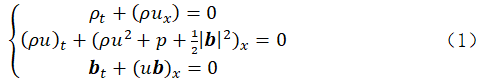 三大守恒定律并电磁效应,可以导出磁流体力学方程组的模型。但是约束条件越少的方程组,实际上越复杂,在选取方程的时候考虑到这一点,本次论文最终采用了,欧拉坐标下,无粘无外力的一维可压缩等熵的mhd方程组: