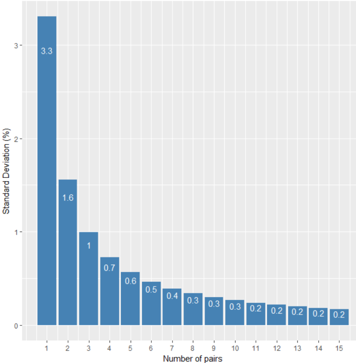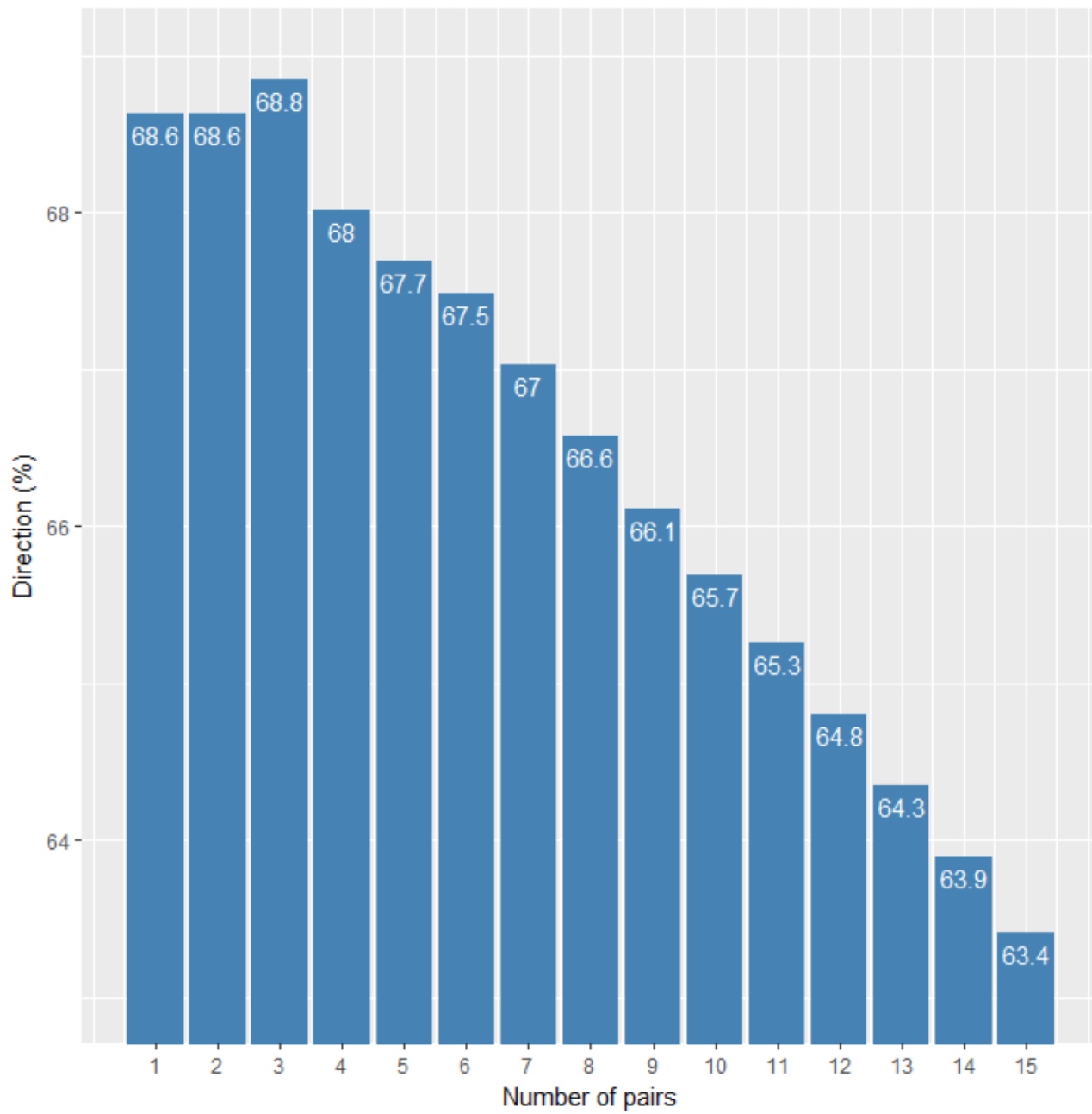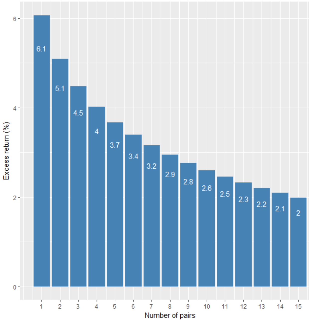 其次,以上证50指数的30只成分股为样本,基于随机森林模型,按照预测-排名-交易的整体框架研究了统计套利的配对交易策略。第一步,利用随机森林模型向前一步预测每只股票的回报率;第二步,根据回报率大小由高到低进行排列。排名高的股票在下一期表现的潜力大,排名低的则潜力小;第三步,制定策略:在交易期,买多排名高的股票,卖空排名低的股票,一期后平仓。如此循环至交易期末。评价指标结果显示:无论配对数是多少,随机森林方法的选股结果的方向精度均显著超过50%,超额收益率显著大于0,标准差也符合经典的投资组合理论。