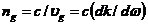 ,代表波包的传递速度。式中f是波的频率,λ是波长,ω是角频率,k是波数。ω与k的关系被称为色散关系。ω正比于k时,群速度与相速度相等,例如真空状态下,群速与相速统一。而在一些色散介质中,ω与k呈非线性关系,群速度会根据介质的色散关系发生改变。在一些高色散介质中,群速度会降低,甚至可以接近于零,这种效应就是慢光效应。