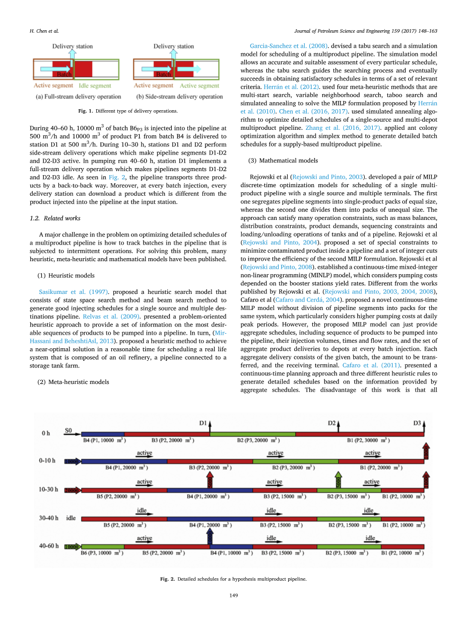 Garcia-sanchez 等人(2008)设计了多产品管道调度的禁忌搜索和仿真模型。模拟模型可以对每个特定的时间表进行准确和适当的评估, 而禁忌搜索则指导搜索过程, 并最终成功地根据一套相关标准获得令人满意的时间表。Herraacute;n 等人 (2012)采用多启动搜索、可变邻域搜索、禁忌搜索和模拟退火四种元启发式方法来求解 Heraacute;n 等人 (2010) 提出的 MILP 公式。Chen 等人, 2016, Chen 等人, 2017。采用模拟退火算法对单源多仓库多产品管道的详细调度进行了优化。Zhang 等人, 2016, Zhang 等人, 2017应用蚁群优化算法和单纯形法, 为基于供应的多产品管道生成详细的批处理调度。