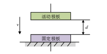 (1)电容式传感器使用电容作为敏感元件,可将机械位移量转化为电容变化量,根据可知,改变极距、两极板间的相对面积以及电介质材料均可使最终的电容量发生变化[18]。通常测振时采用变极距式电容传感器,它的原理图如图2.1所示。当使用电容传感器测量振动时,固定极板将随被测物一起运动,从而使得固定极板和活动极板之间的距离d发生变化,电容量随之改变,根据公式可得到电容变化量。它的环境适应能力强,受温度影响较小,在微小位移变化的测量方面具有不可比拟的优势,但也有它的缺点,电容检测电路为非线性,不利于后续特性曲线的拟合,而且传感器的测量范围较小。