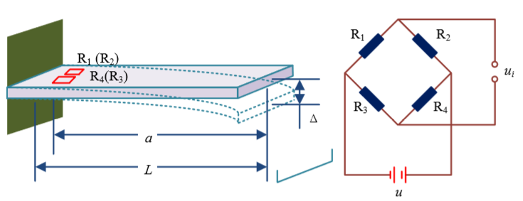 (2)电阻式振动传感器使用电阻应变类型(这里主要指应力)的材料作为检测的敏感元件,将其安装在弹性元件上,可以用来检测受力时的位移,常用的是悬臂梁式的位移传感器[19]。它结构简单,应用广泛,在测量应力、位移方面都有很好的应用,如电子秤。但电阻式传感器的输出信号较弱,而且有较大的时漂温漂,长期检测会导致传感器材料的性能发生变化,无法保证数据的准确性,因此不适用于长期测量。其原理图如图2.2所示。