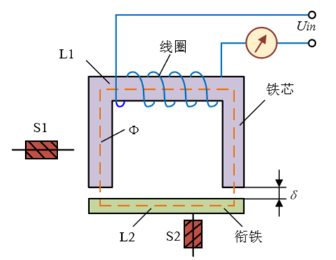 (3)电感式传感器利用了电磁感应原理来实现位移测量,常见的电感式传感器使用铁芯和衔铁作为导磁材料,当机械振动带动衔铁运动时,气隙的磁阻会发生改变,同样整个磁路也会随着衔铁的运动而改变,线圈电感就会发生变化[20]。其原理图如图2.3所示。它的结构简单、工作可靠、有较高的线性度和精度、温度适应性强,缺点是响应较慢,不适用于快速动态测量。