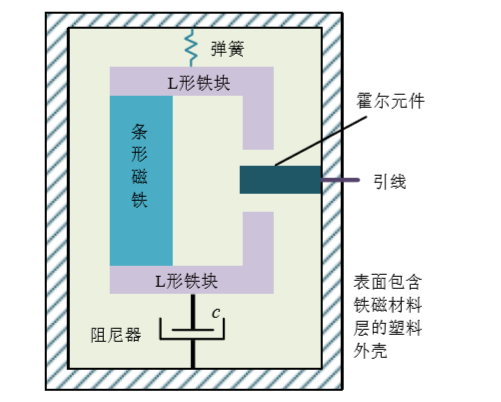 (5)霍尔传感器是利用霍尔效应制作而成的磁场传感器。测振时,先将传感器的外壳固定于被测机械上,该接触需为刚性接触,这样机械的振动方向与传感器内的磁铁的振动方向是一致的。机械发生振动时,带动着霍尔元件的外壳振动,磁铁相对外壳产生位移,霍尔元件所在的磁场位置发生改变,使得它的输出的电压发生变化[22]。其工作原理图如图所示。霍尔传感器结构简单、体积小、重量轻、价格低廉,而且采用霍尔元件频带宽,动态特性好,不怕灰尘、油污、水汽。但它的互换性较差,信号随温度变化,输出为非线性,需要进行非线性和温度校正。其原理图如图2.5所示。